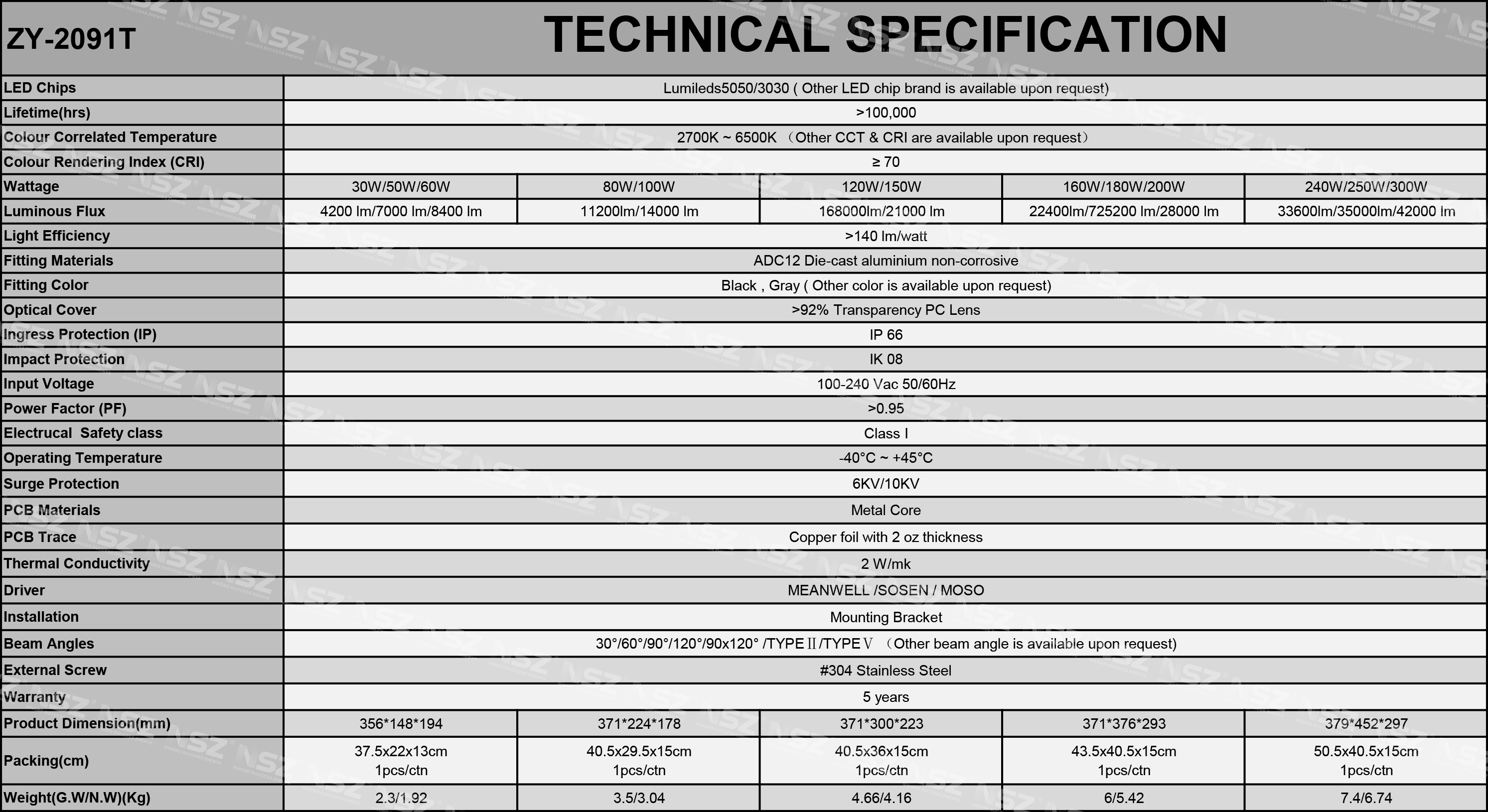 30W টানেল লাইট, 50W টানেল লাইট, 60W টানেল লাইট, 80W টানেল লাইট, 100W টানেল লাইট, 120W টানেল লাইট, 150W টানেল লাইট, 160W টানেল আলো, 180W টানেল লাইট, 240W টানেল লাইট, 250W টানেল লাইট, 250W টানেল লাইট, 250W টানেল লাইট থেকে ওয়াটেজ , 300W টানেল আলো।
